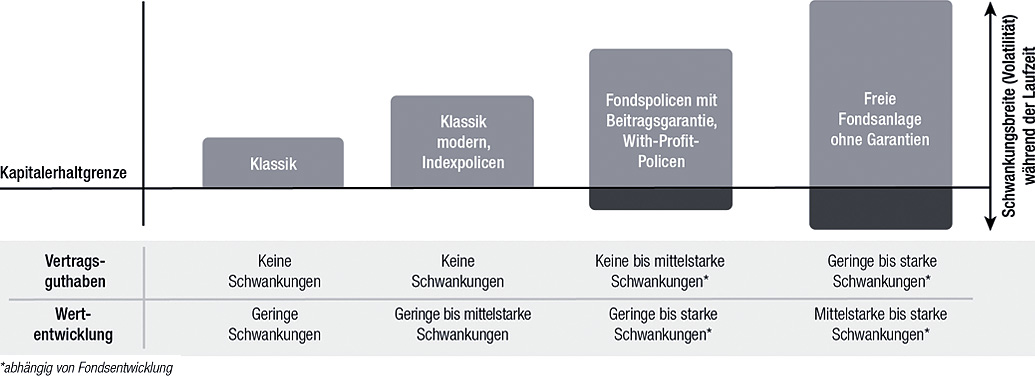 - Modernisierte Formen der klassischen Kapitalanlage: Kapitalanlagearten mit reduzierten Garantien und erhöhter Überschussbeteiligung oder mit Indexpartizipation (Indexpolicen).